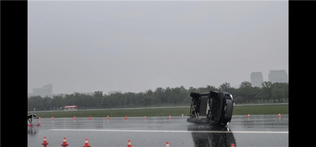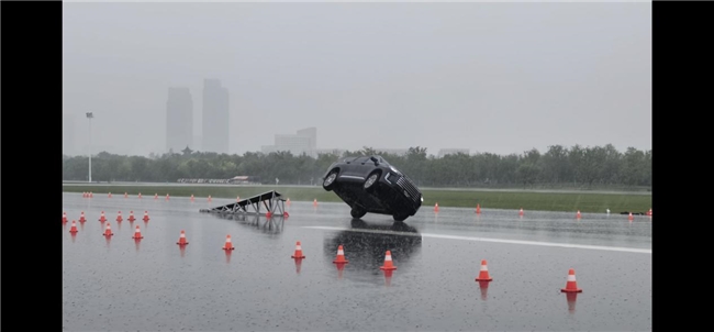 当天测试时暴雨倾盆,车手驾驶揽月C-DM进行两轮侧行驶时重心失衡,车辆意外发生侧翻。根据直播现场视频画面,车辆侧翻后,车身框架无明显溃缩,四门正常开启,驾驶员自行脱困,无漏液起火,这一优秀表现绝非偶然,而是揽月长久以来“安全是最大的豪华”理念的具象化演绎。